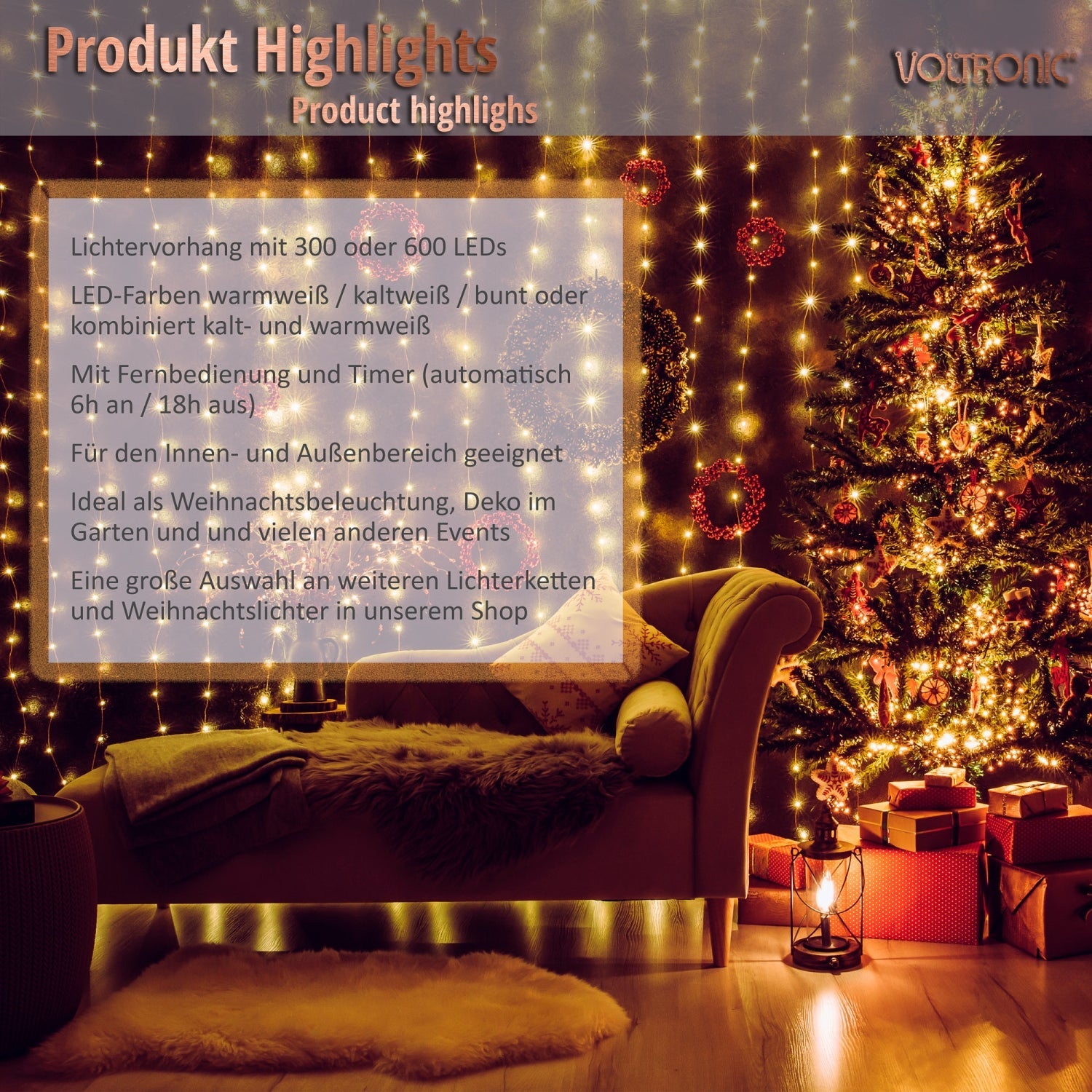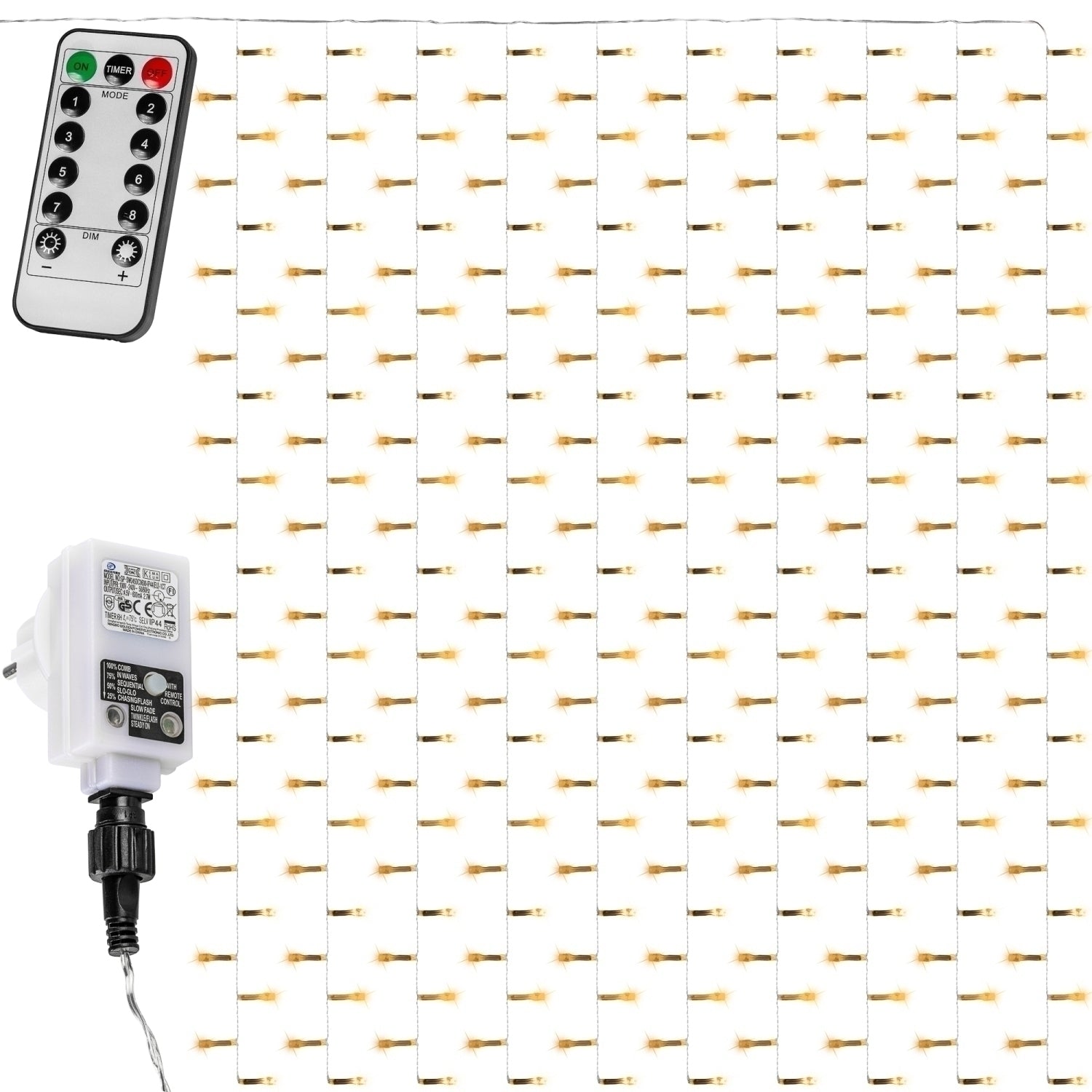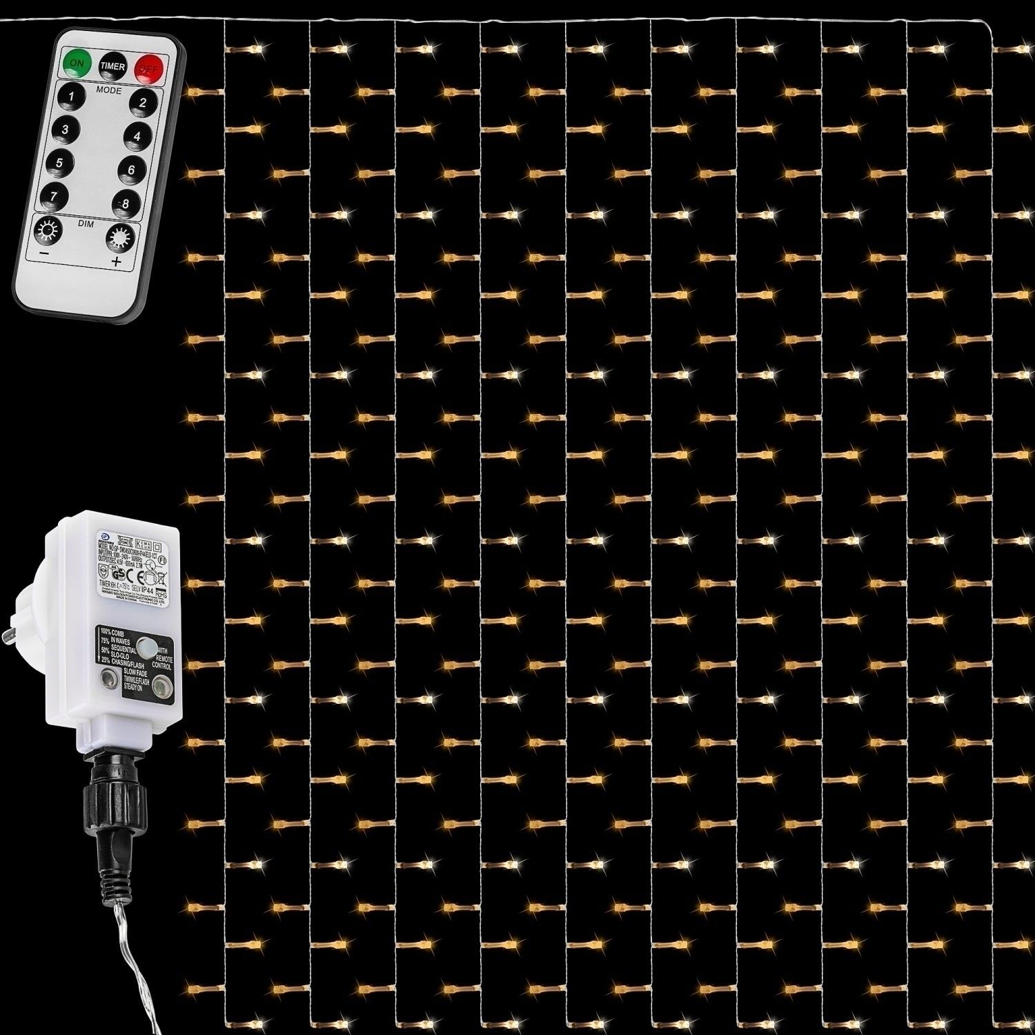 Le rideau lumineux LED VOLTRONIC avec câble transparent convient à une utilisation intérieure et extérieure grâce à la classe de protection IP 44. Les lampes LED sont très économiques avec 4,5 Watt (5mA) pour 300 LED et 9 Watt (5mA) pour 600 LED. Nos lumières de Noël ont un câble de 5 m vers l'adaptateur et une télécommande. Avec cette télécommande, vous pouvez contrôler la minuterie, les 8 réglages d'éclairage et la fonction variateur.