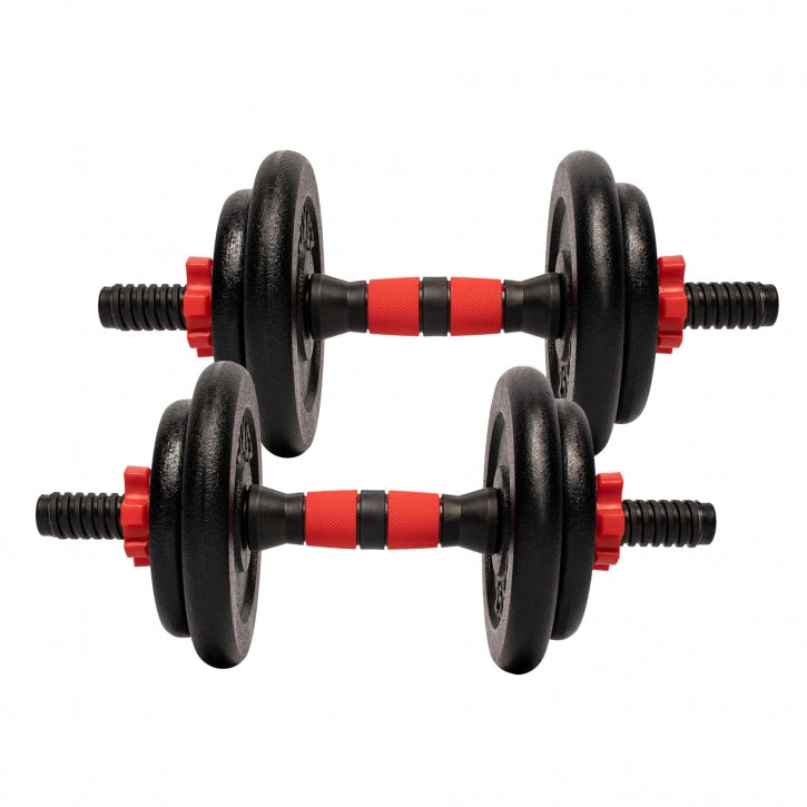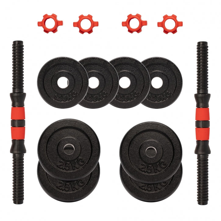 - Inhoud: 4 x 2.5 kg, 4 x 1.25 kg, 2 dumbellstangen en 4 schroefsluitingen