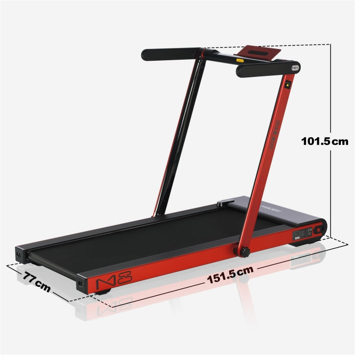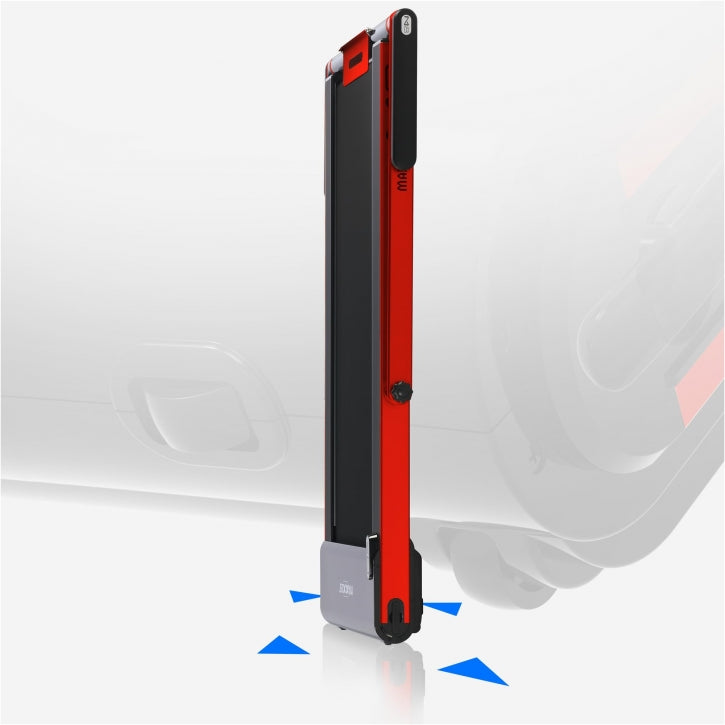 Tijdens het trainen heeft de MAXXUS loopband M8 slechts een vloeroppervlak van 151,5 x 77 cm nodig, wat overeenkomt met slechts 1,16 vierkante meter. Door zijn extreem lage hoogte van 13,5 cm ingeklapt, kan de MAXXUS M8 loopband snel en gemakkelijk worden opgeborgen onder bijvoorbeeld een bed. Met behulp van de transportrollen is een afstand van ca. 14 cm tussen een kast en de muur voldoende om de loopband comfortabel verticaal in deze opening op te bergen. De hoogte van het loopvlak is ca. 9,5 cm, dus de MAXXUS loopband M8 kan nog steeds gebruikt worden met plafondhoogtes die te laag zijn voor conventionele loopbanden.