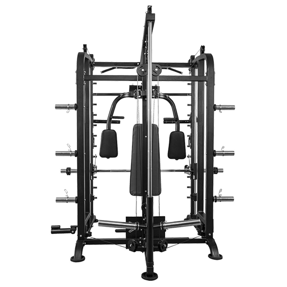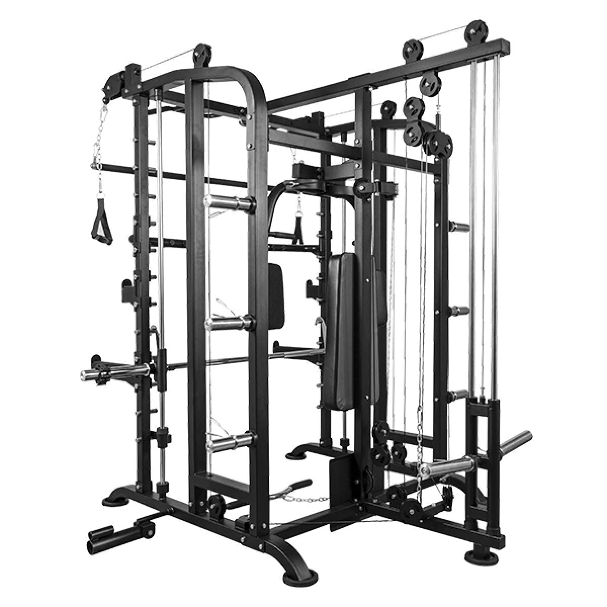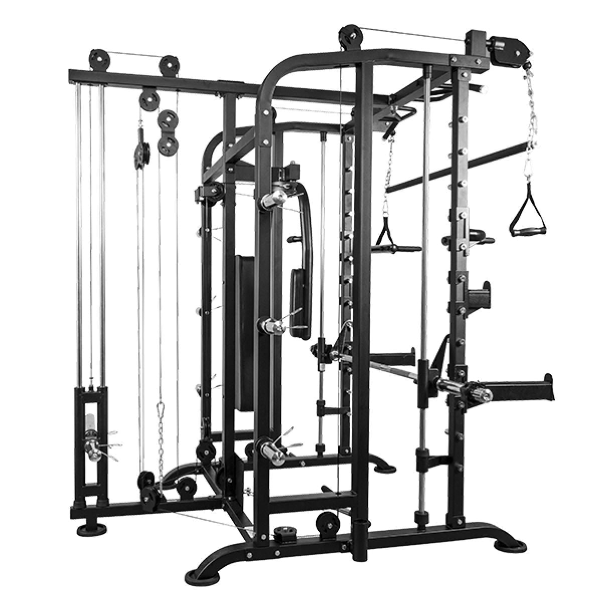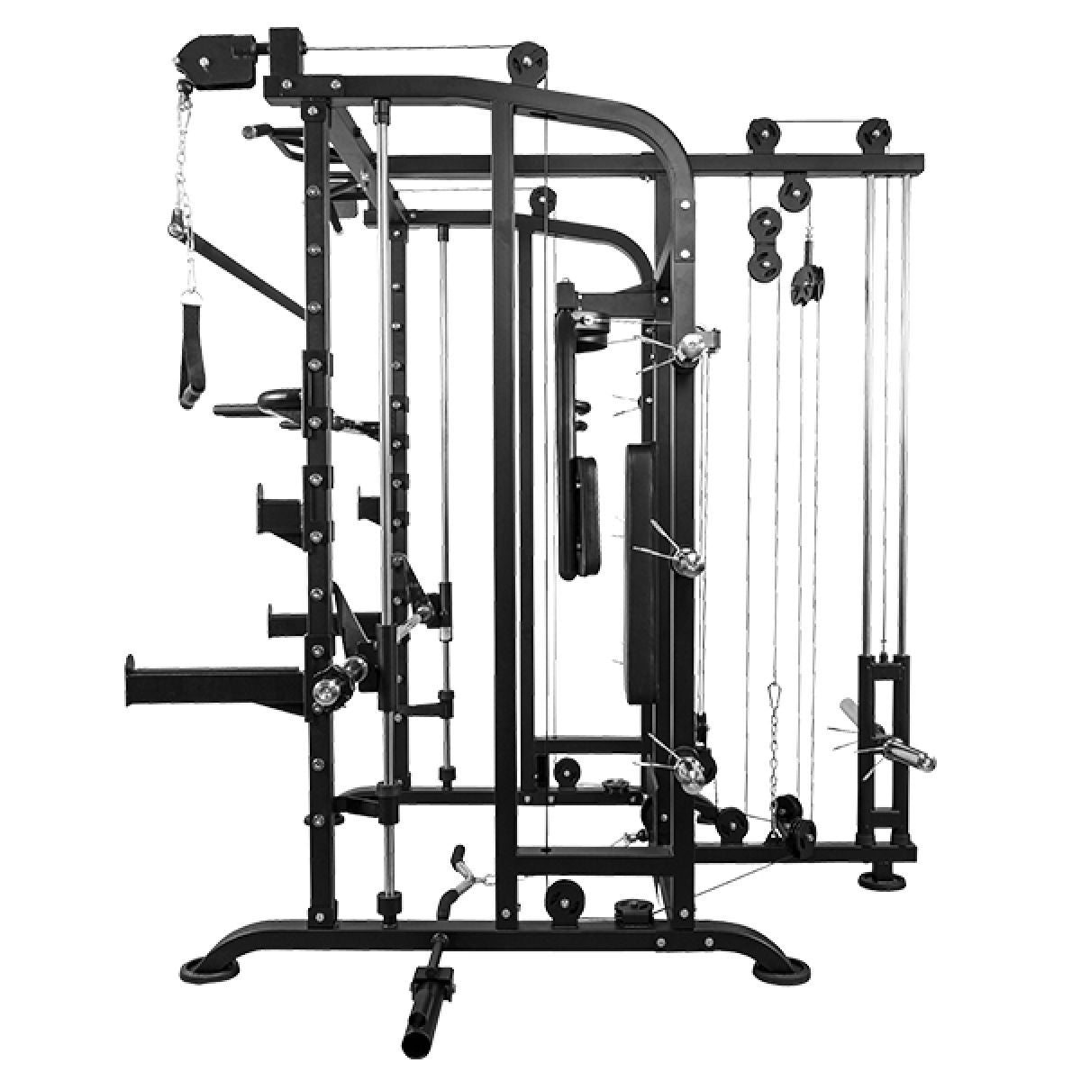 Deze Smith Machine biedt je talloze mogelijkheden voor krachttraining. Je kunt bijvoorbeeld squats en bench presses veilig uitvoeren dankzij de geleiderails en veiligheidsstoppers. De geïntegreerde butterfly zorgt ervoor dat je je borst- en schouderspieren effectief kunt trainen. Daarnaast maakt de pull-up stang het mogelijk om je rugspieren aan te pakken, en met de dip-handgrepen richt je je op de triceps. Het kabeltreksysteem voegt nog meer variatie toe, zoals lat pulldowns en triceps pushdowns.