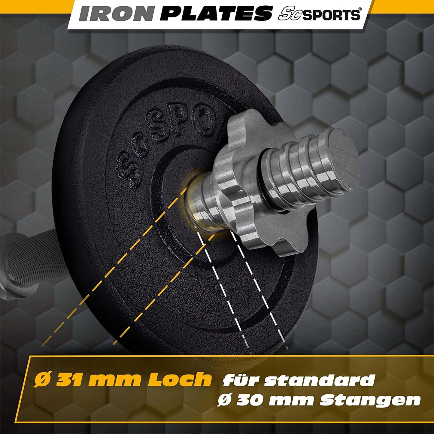 De gietijzeren halterschijven hebben een boring van 30/31 mm en zijn daarom perfect afgestemd op alle gangbare halterstangen met een diameter van 30 mm. Dit voorkomt verschuiven of klapperen tijdens de training.