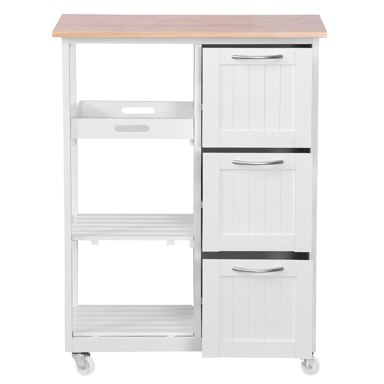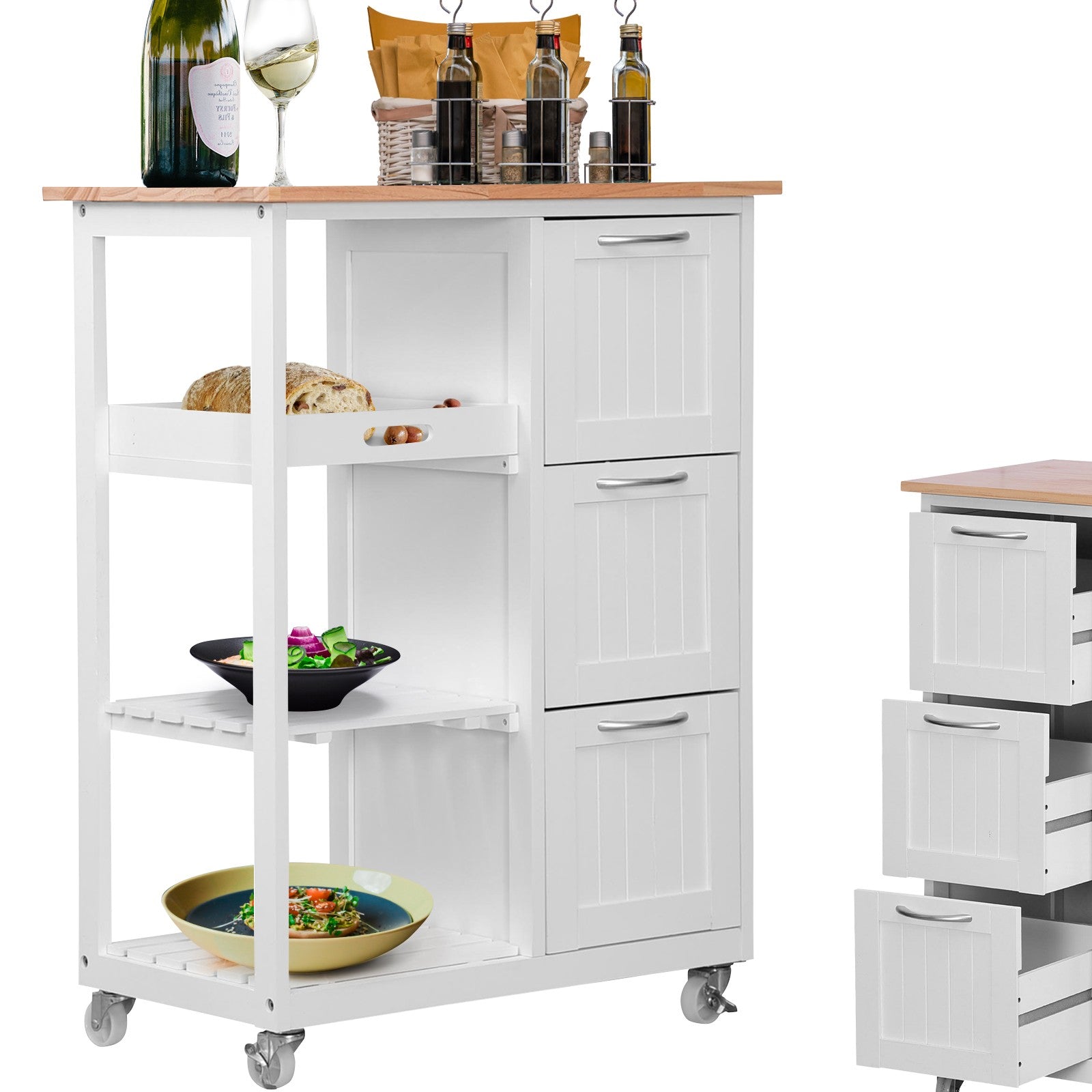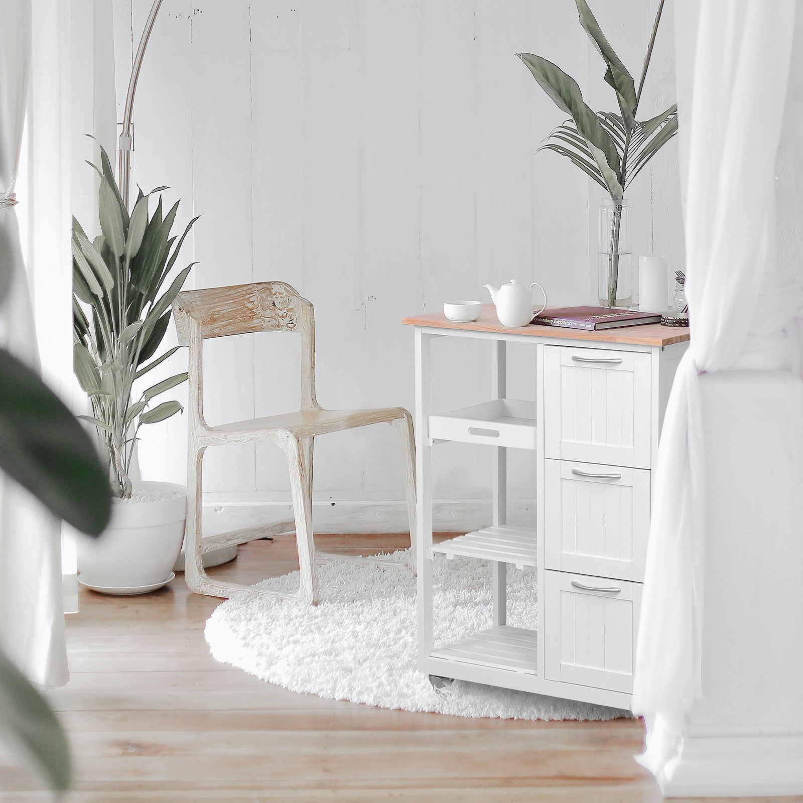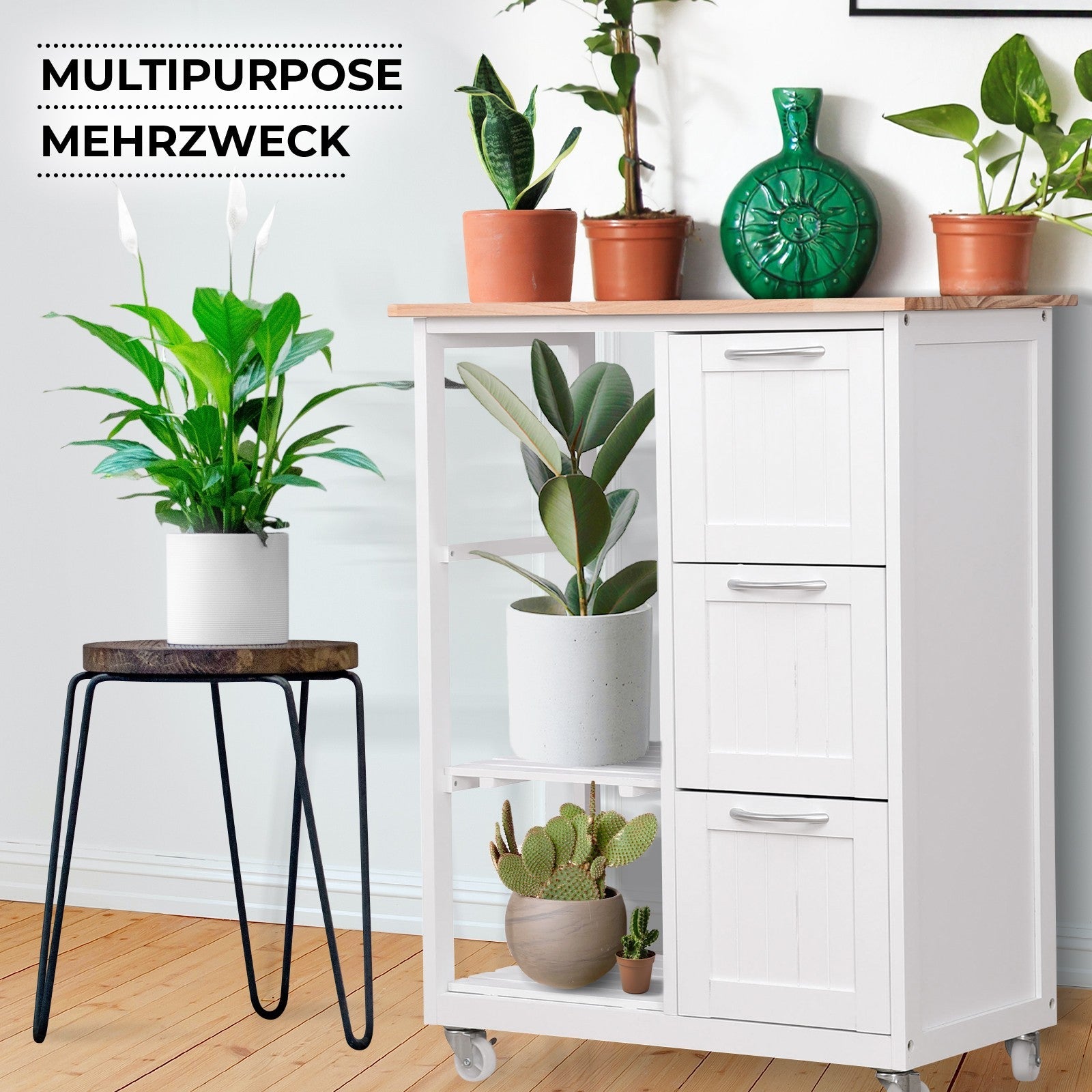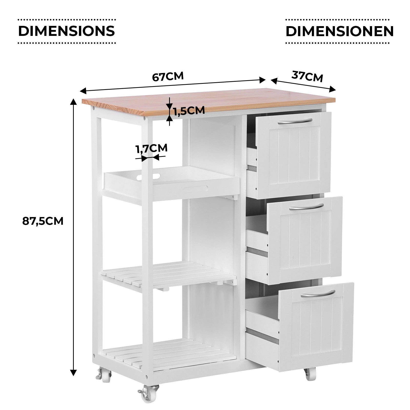 Keuken trolley op wieltjes - 3 lades en 3 plankjes - Wit Altijd al een keukentrolley in de keuken willen hebben? Dan hebben wij nu een superleuke aanbieding voor jou! De keukentrolley is gemaakt van hoogwaardig materiaal en handig in gebruik. Door zijn compacte formaat en moderne uitstraling past hij in iedere keuken. Door de zwenkwielen is deze trolley praktisch in gebruik. Zet hem op een vaste plek in de keuken of rol hem door jouw appartement of woonkamer. De trolley is onder andere geschikt om jouw (kook)boeken of keukenaccessoires goed te organiseren en bij de hand te hebben. Gebruik de trolley in de keuken of zomers bij het bbq’en. Uiteraard dient hij ’s avonds wel weer binnen te worden gezet. Deze keukentrolley beschikt over diverse planken en lades en heeft hierdoor een ruime opslagcapaciteit. * Keuken trolley op wieltjes, 3 lades en 3 plankjes, in wit, country house stijl. * Een van de niveaus dient ook als een verwijderbare serveer tray. * Afmetingen: 67 x 37 x