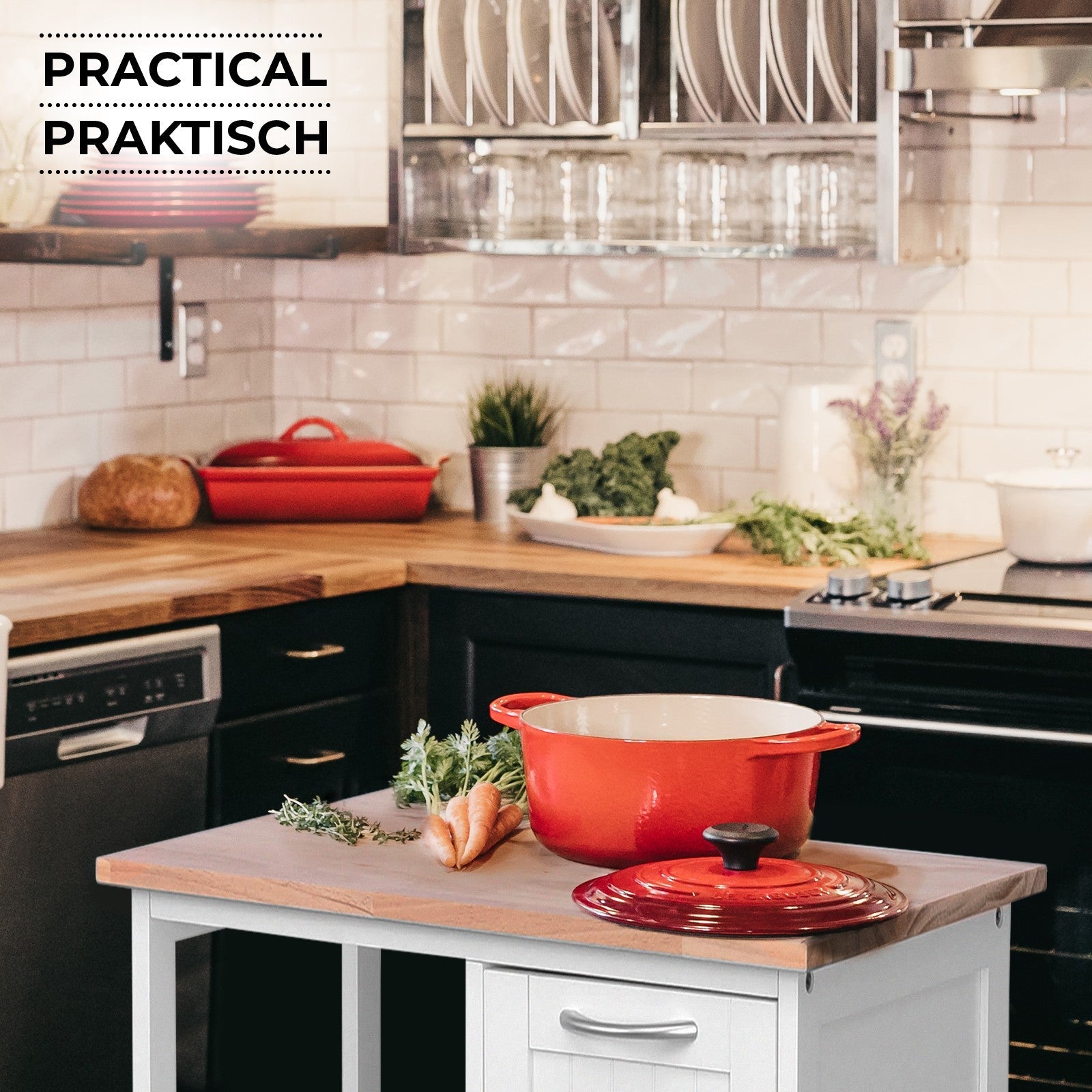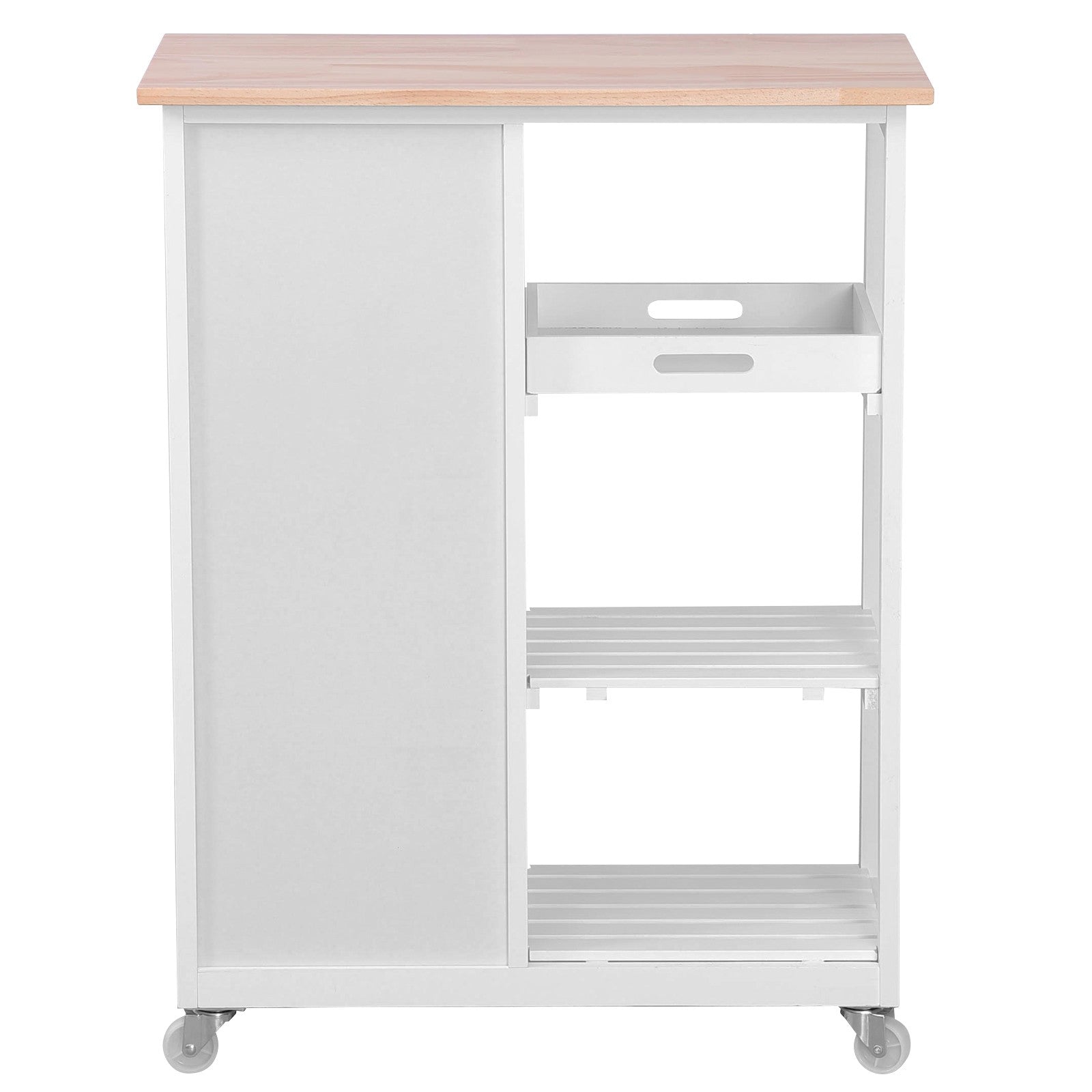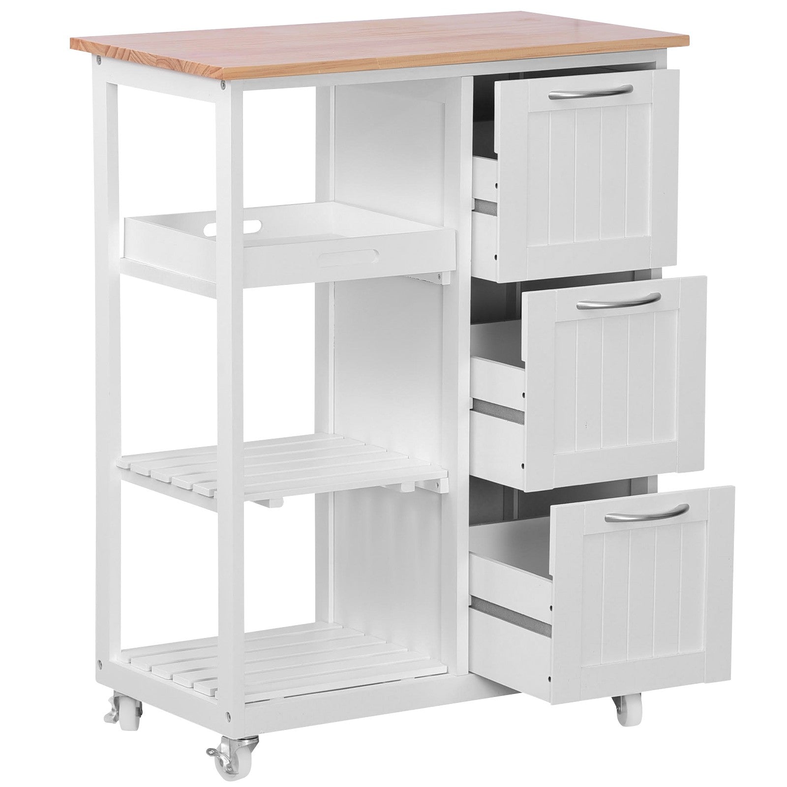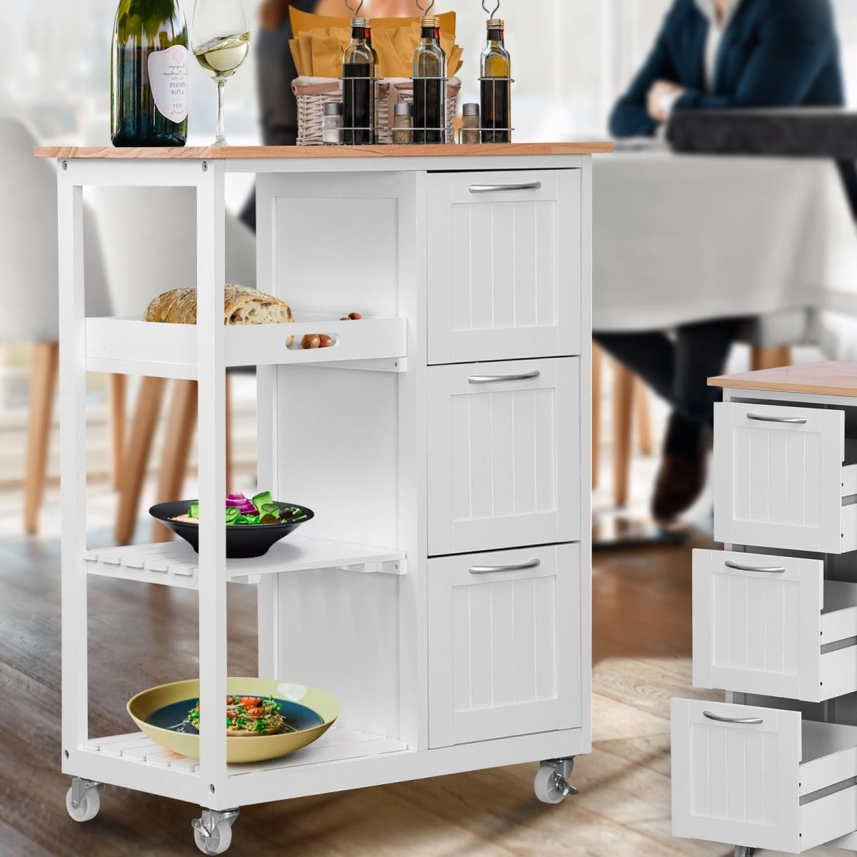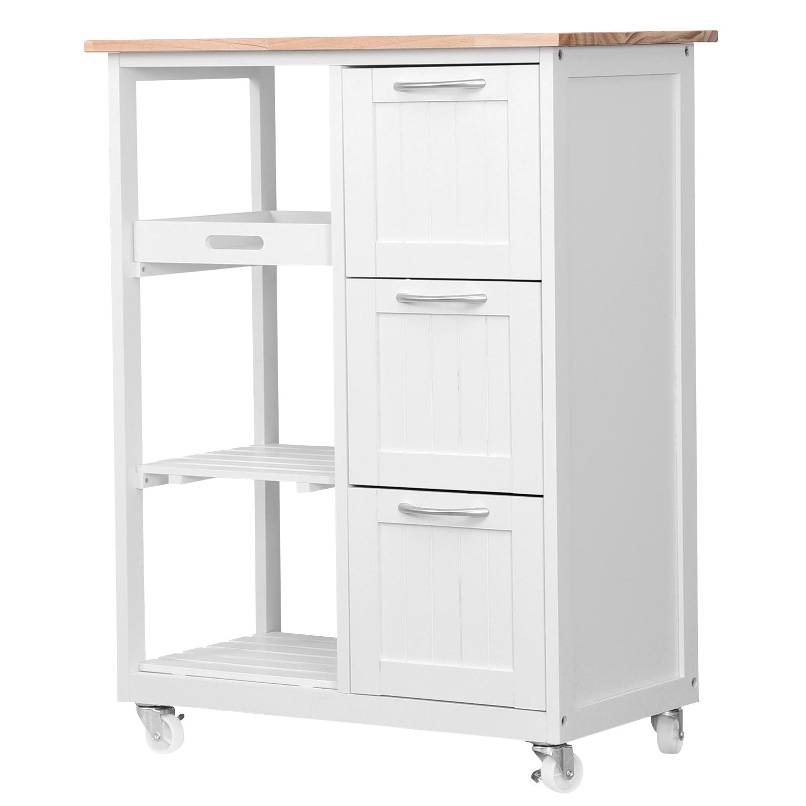 Keuken trolley op wieltjes - 3 lades en 3 plankjes - Wit Altijd al een keukentrolley in de keuken willen hebben? Dan hebben wij nu een superleuke aanbieding voor jou! De keukentrolley is gemaakt van hoogwaardig materiaal en handig in gebruik. Door zijn compacte formaat en moderne uitstraling past hij in iedere keuken. Door de zwenkwielen is deze trolley praktisch in gebruik. Zet hem op een vaste plek in de keuken of rol hem door jouw appartement of woonkamer. De trolley is onder andere geschikt om jouw (kook)boeken of keukenaccessoires goed te organiseren en bij de hand te hebben. Gebruik de trolley in de keuken of zomers bij het bbq’en. Uiteraard dient hij ’s avonds wel weer binnen te worden gezet. Deze keukentrolley beschikt over diverse planken en lades en heeft hierdoor een ruime opslagcapaciteit. * Keuken trolley op wieltjes, 3 lades en 3 plankjes, in wit, country house stijl. * Een van de niveaus dient ook als een verwijderbare serveer tray. * Afmetingen: 67 x 37 x