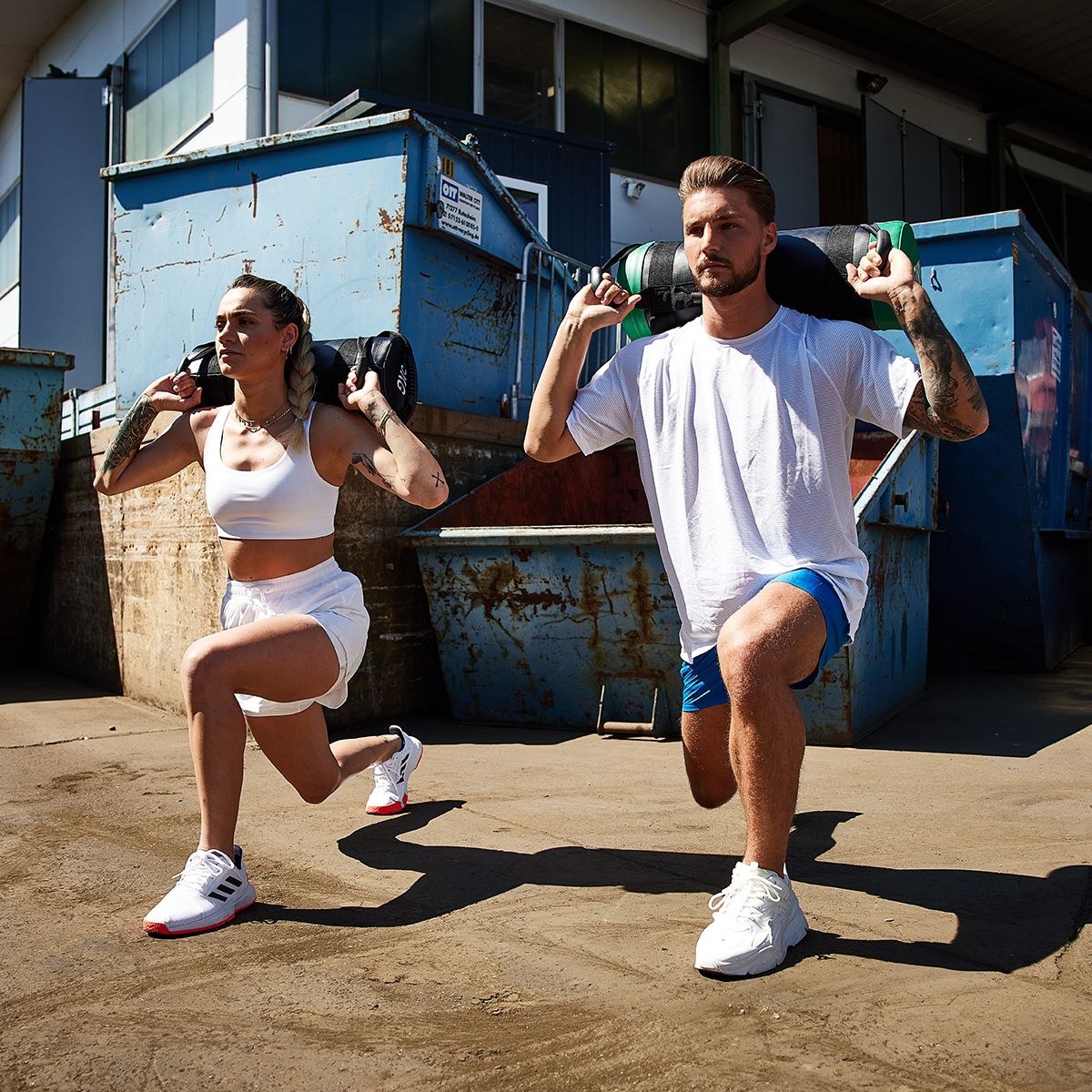 - Squats: houd de sandbag op schouders voor een workout voor benen, billen en rug.